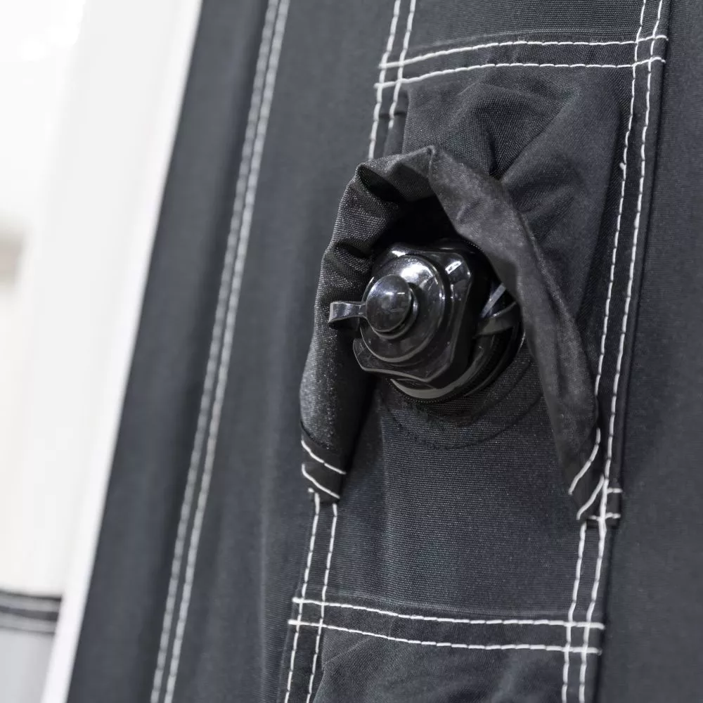Der Aufbau gestaltet sich mehr als einfach: Mit dem innovativen Einpunkt-Aufblassystem lässt sich das Vorzelt an nur einem einzigen Aufblaspunkt komplett füllen. Die standarmässigen Abspannleinen sorgen für noch mehr Stabilität und noch bessere Leistung bei Windböen oder Sturm. Das Club Air All-Season verfügt über eine markante Dual-Pitch-Spitze, die diesem Vorzelt seine unverwechselbare Ästhetik verleiht. Das Zeltdach des Dometic Club Air All-Season 390 besteht zusätzlich aus dem Dual-Pitch-Roof System. Das bedeutet, dass Wind und Regenwasser noch besser abfliessen können, um Wassersäcke oder ein Durchhängen des Daches zu vermeiden.