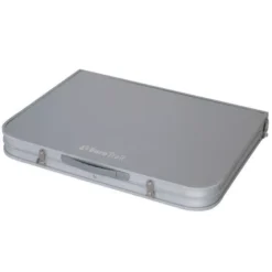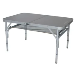 Der Campingtisch Eurotrail Monnai besteht aus einem stabilen Aluminium-Rahmen mit rutschfesten Füssen. Der Tisch ist zusammenklappbar und wird mit einer Reisetasche geliefert. Die Tischoberfläche ist wasserdicht und hitzebeständig. Mit Nylon-Mesh Zusatzablage unter der Tischplatte zum Ablegen von Kleinigkeiten, wie z.B. Zeitung. Der Tisch lässt sich in zwei Höhen aufstellen und kann so auch als separater Kindertisch genutzt werden.