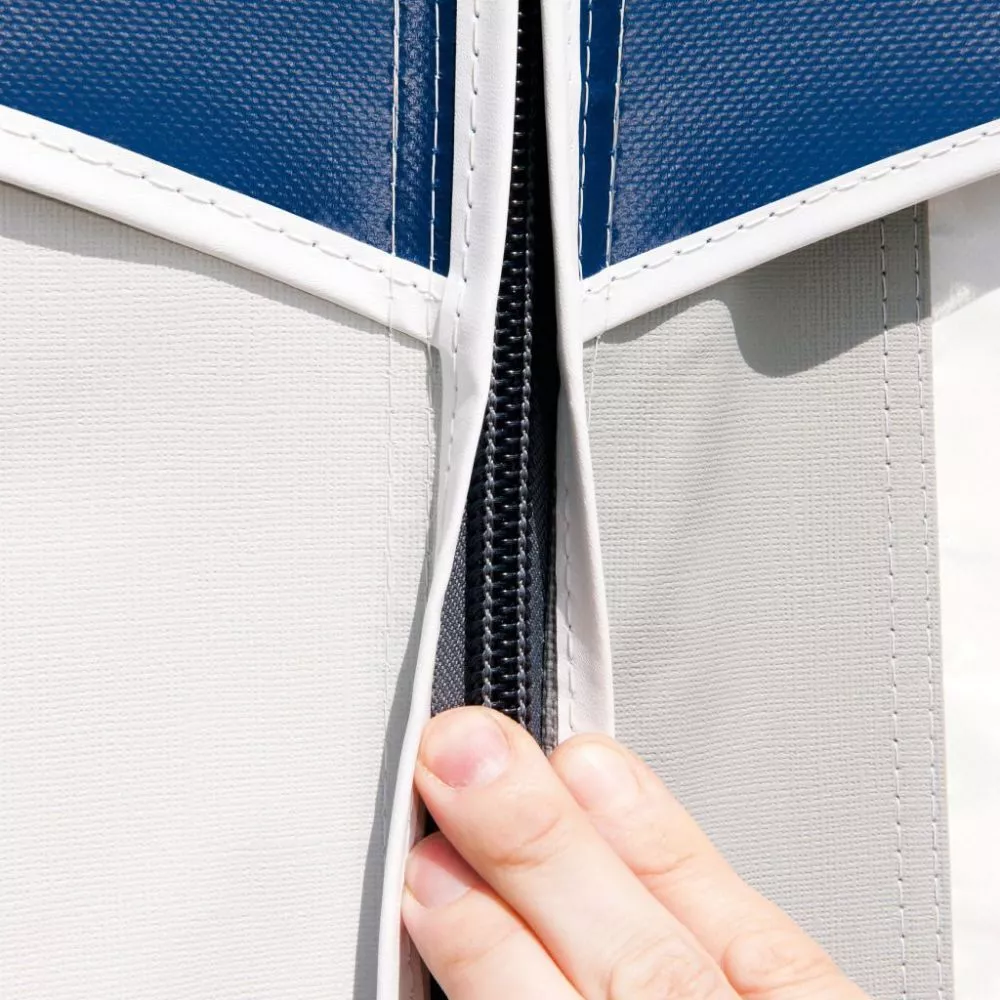 In den SeitenwĂ€nden sind grosse Fenster mit Gazeeinsatz eingearbeitet. Sie können mit praktischen PrĂ€gefolienfestner fĂŒr mehr PrivatsphĂ€re geschlossen werden. Die rechte Seite hat eine seitlich wegrollbare EingangstĂŒre, fĂŒr einfacheren Zugang zum Vorzeltinneren. FĂŒr mehr Platz oder als Schlafplatz fĂŒr GĂ€ste kann ein optionaler Seitenanbau rechts am Vorzelt angebracht werden. Die Seitenwand dient hier als Trennwand und kann somit einfach bestehen bleiben.