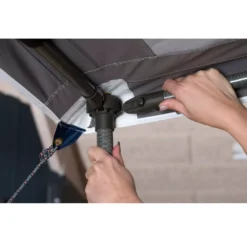 Das CarbonX Gestänge mit IsaFix-Schnellverschlüssen und Tectum Pro Verbindungselementen für den einfachen Zusammenbau der Stangen ermöglicht einen schnellen Aufbau und ein geringes Gewicht. Im mitgelieferten Gestänge- und Zeltsack lässt sich das Sonnendach transportieren und aufbewahren.