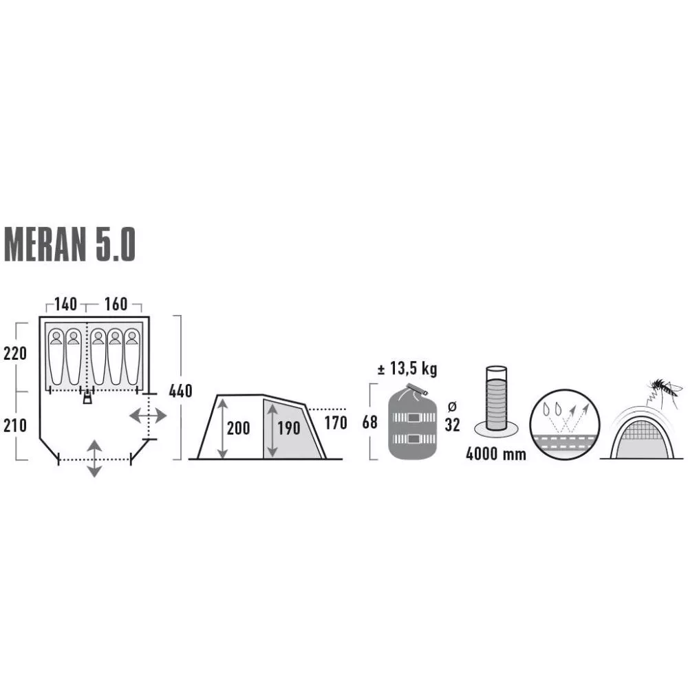 Das kompakte Tunnelzelt High Peak Meran 5.0 mit eingenähtem Boden hält Feuchtigkeit, Schmutz und Krabbeltiere aus dem Zelt. Der Wohnraum mit 2 Metern Stehhöhe bietet ausreichend Kopffreiheit und Platz für die Camping Ausrüstung. Die 2 Moskitonetz-Zelteingänge belüften den Wohnbereich und halten Insekten draussen. Die 3 Klarsichtfolienfenster bringen Licht in den Wohnraum während Gardinen vor neugierigen Blicken schützen. Das Dach hat eine Aluminium-Beschichtung und ist Hitze reflektierend.