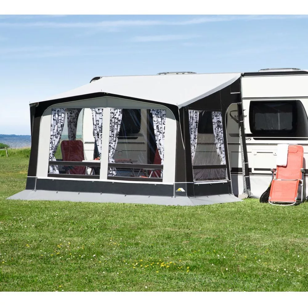 Beide Seitenwände sind mit einer seitlich wegrollbaren Tür ausgestattet. Die grossen Fenster lassen viel Tageslicht ins Vorzelt. Die modischen, mitgelieferten Gardinen schaffen eine angenehme Atmosphäre. Für eine gute Querbelüftung bei jeder Wetterlage sorgen die Moskitonetze unterhalb der Fenster mit ausstellbaren Folienklappen und die integrierten Hochentlüftungen in den Seitenwand-Elementen.