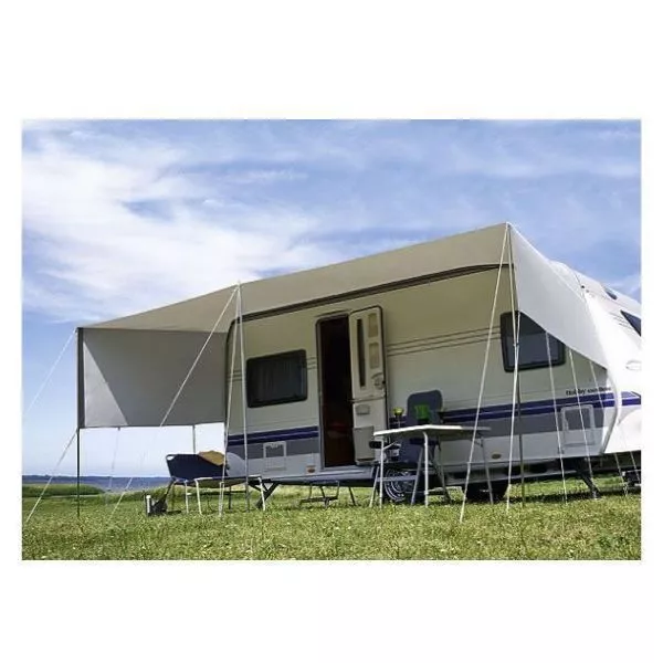 Wenn das nicht praktisch ist: Das ultraleichte Sonnendach dwt Tour Plus mit integriertem Windschutz können Sie sowohl längsseitig am Caravan einziehen, als auch rechts bzw. links – je nach Stand der Sonne und Windrichtung. Angenommen, der Wind oder die Sonneneinstrahlung kommen von rechts – ziehen Sie das Sonnendach Tour Plus nach rechts. Das Sonnendach reicht auf dieser Seiten dann bis zum Boden.