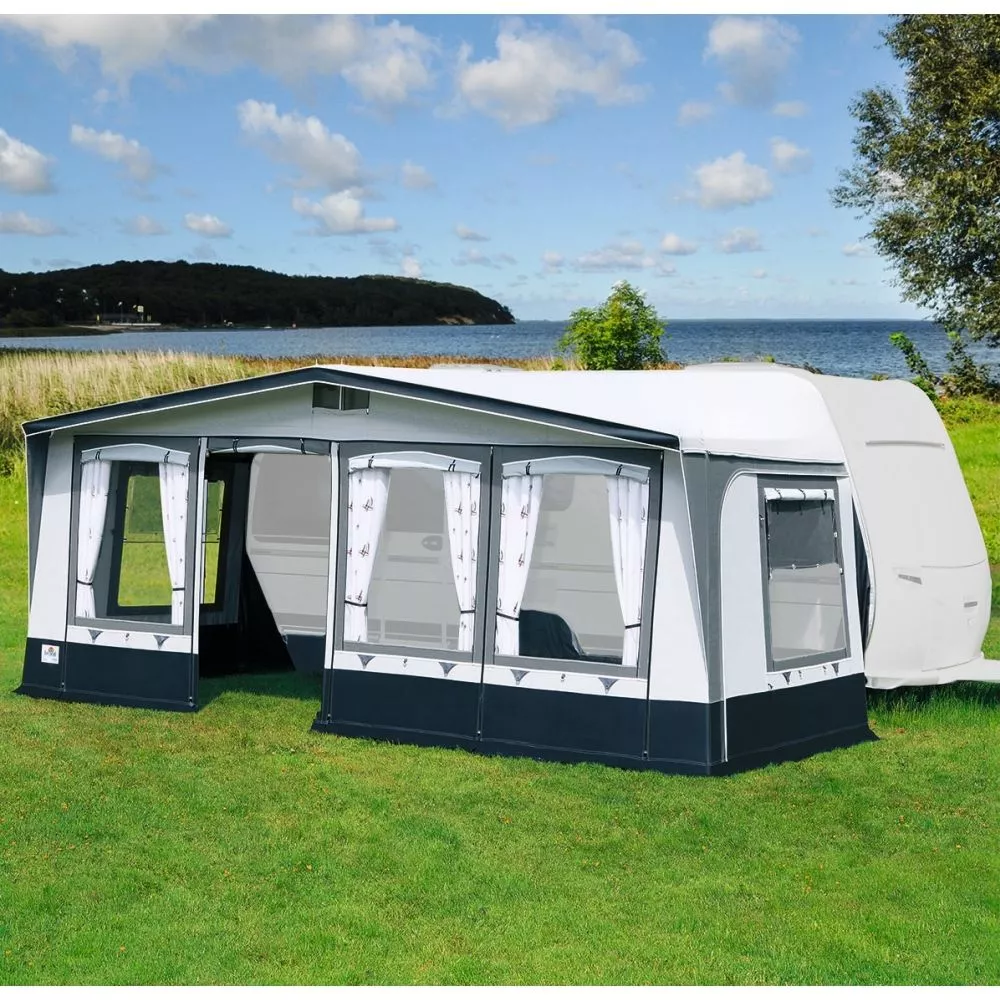 In der Gestaltung bist du sehr flexibel: Durch die Element-Technik der Front, kannst du die Türposition frei wählen. Der beliebte Veranda-Effekt ist mit zusätzlichen Balkonstangen ebenfalls möglich. Benötigst du nur ein luftiges, Schatten spendendes Wohnwagen-Sonnendach, entfernst du einfach alle Front- und Seitenwand-Elemente.
