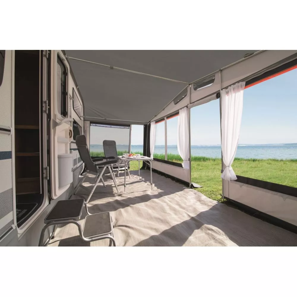 Das Vorzelt DWT Prinz Plus 240 ist das perfekte Caravanvorzelt für Dauer- und Saisoncamping, da es mit dem stabilen 28 mm Stahlgestänge ausgestattet ist,. Die schöne Farbkombination dieses modernen Vorzeltes liegt voll im Trend. Die verarbeiteten Materialen trotzen jedem Wetter, lassen sich leicht reinigen und sind besonders robust. Die innen eingenähten Hohlsäume in den Wänden nehmen Zusatzstangen für mehr Stabilität auf. Die Vorderwand-Segmente lassen sich zu einer Veranda abklappen. Für mehr Platz kannst du beim DWT Prinz Plus 240 auf der rechten Seite einen optionalen Erker anbauen.